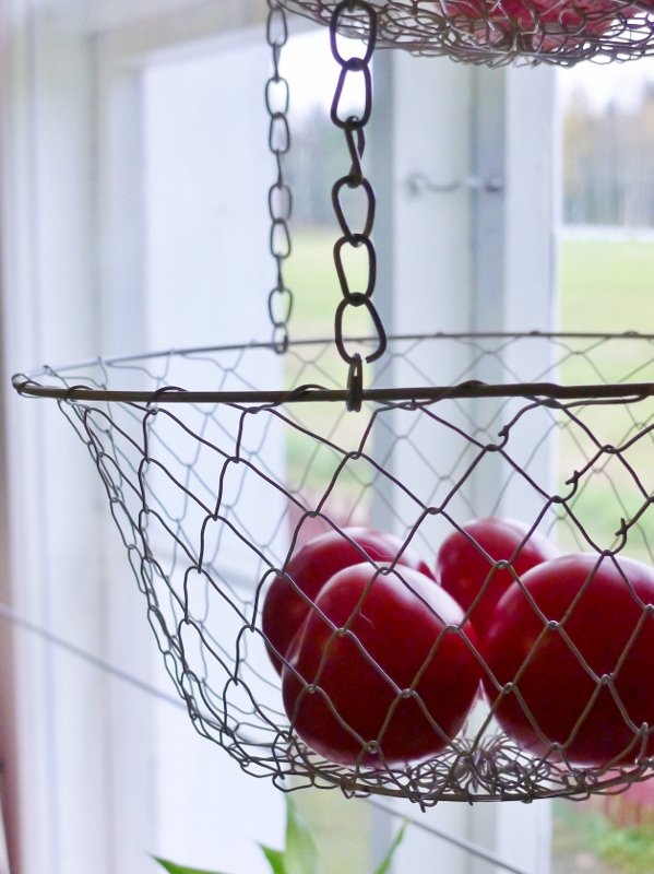 Ikkunan sivussa roikkuu kolmekerroksinen verkkokori, jollaista metsästin kauan, kunnes se löytyi - ystävän kotikirppikseltä! :)