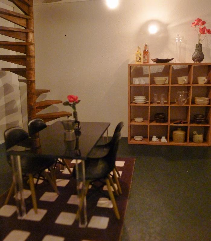 Laitetaan nyt vielä yleiskuvia, kun haluatte kumminkin nähdä. (Tämä ei kai kuulu haasteeseen.) Lattia on ihana! Tykkään siitä todella paljon, se tehtiin teippaamalla vaaleanruskeaksi värjättyyn lattiaan ruudukko maalarinteipillä, ja sitten värjättiin vähän lisää Kiva-petsilakalla. Viimeiseksi muutama kerros kirkasta lakkaa päälle, ja hyvin on kestänyt jo 16 vuotta. Jotkut erehtyvät luulemaan sitä parketiksi, joidenkin mielestä se näyttää muovimatolta... Työtasot ovat koivua, mieheni tekemät, kuten siis kaapistotkin. (Joko minä kerroin, että mieheni on puuseppä ja osaa tehdä mitä vaan?)